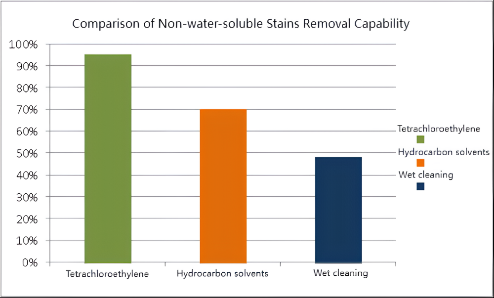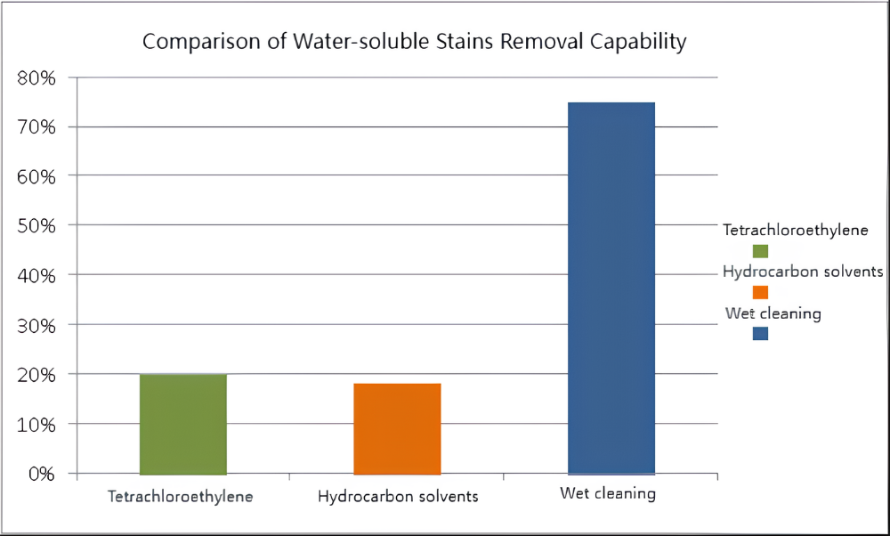 การทำความสะอาดแบบเปียกมีความสามารถสูงสุดในการขจัดคราบที่ละลายน้ำได้ ซึ่งสามารถเข้าถึงได้ถึง 75% ตามด้วยตัวทำละลายเตตระคลอโรเอทิลีนและไฮโดรคาร์บอน